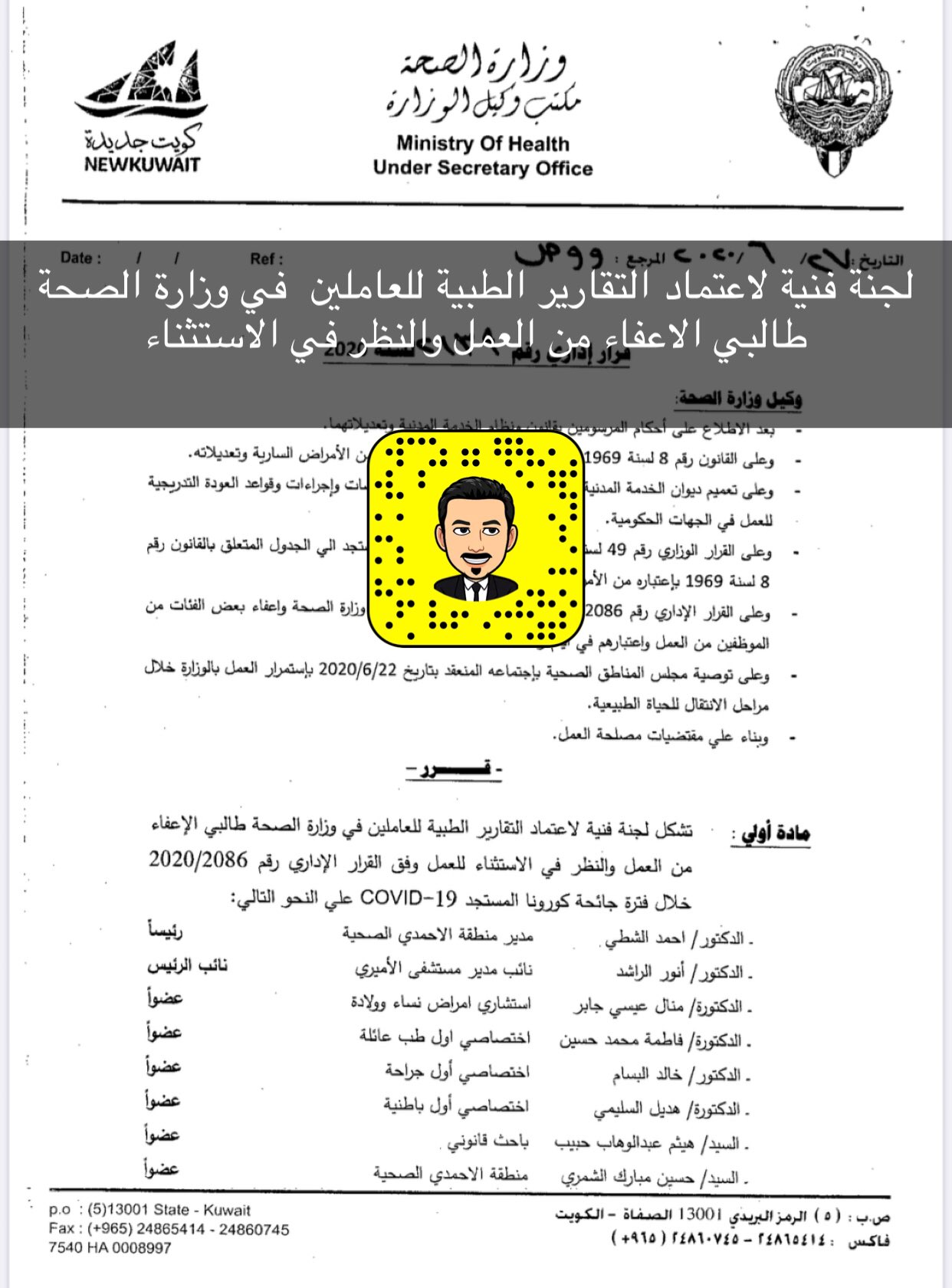 عبدالكريم العبدالله A Twitter الصحة تشكل لجنة فنية لاعتماد التقارير الطبية للعاملين في وزارة الصحة طالبي الاعفاء من العمل والنظر في الاستثناء برئاسة د احمد الشطي تقدم طلبات الاعفاء او الاستثناء الكترونيا